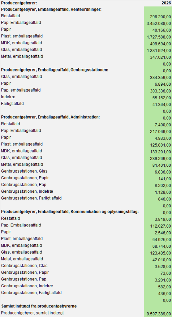 Albertslund Kommune har vedtaget producentgebyrer for emballageaffald for 2026. Gebyrerne fremgår af nedenstående tabel.