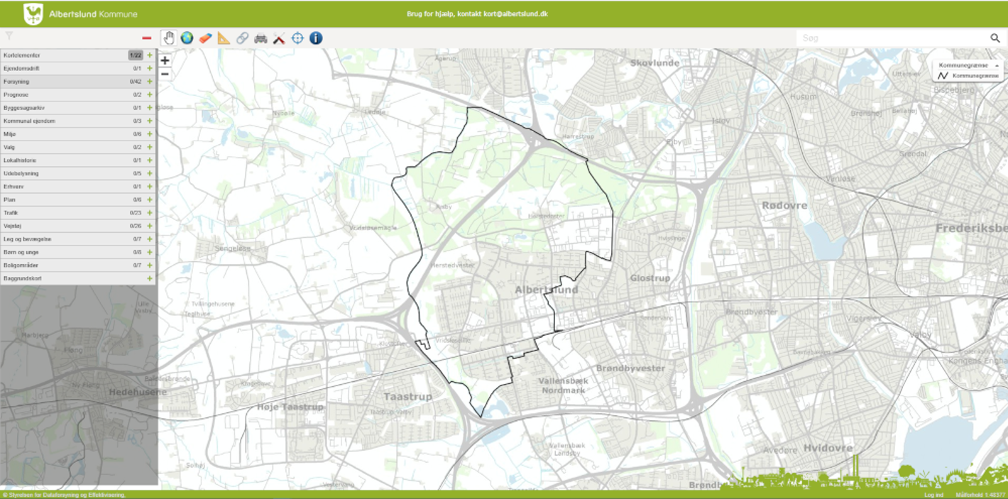Kortservice er Albertslund Kommunes digitale kortværk hvor du kan finde mange forskellige slags kort, opmåle arealer, fremsøge adresser mv.