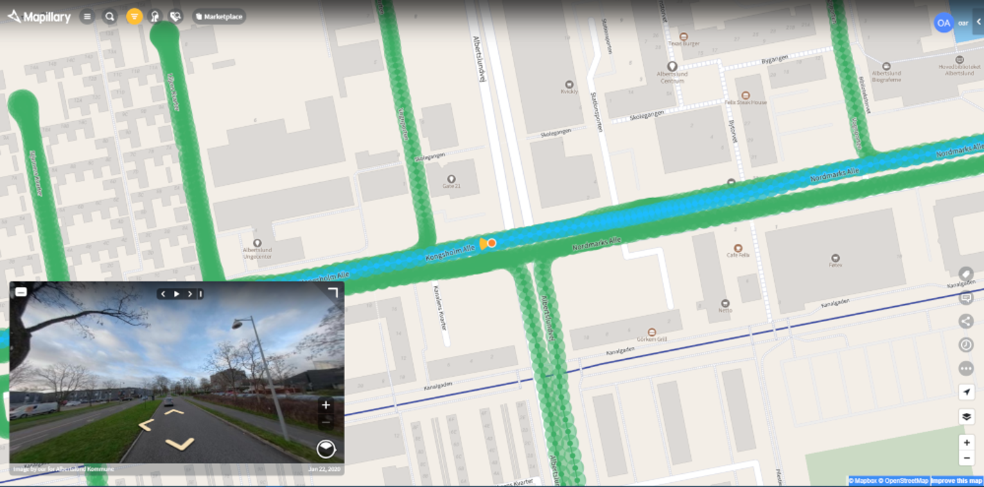 Her kan du se de gadebilleder Albertslund Kommune bidrager med til Mapillary gadefotos. Hvis du ønsker at se alle tilgængelige Mapillary billeder kan du fjerne filteret ved at trykke på den gule knap i menuen og trykke på krydset ud for 'oar' og 'cce'. Du kan evt også vælge at se billeder der ikke er 360 graders panoramaer i samme menu.