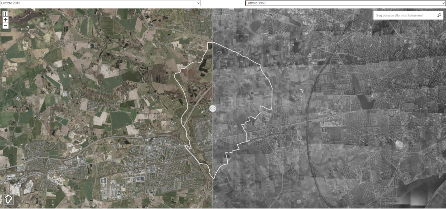 Her kan du sammenligne luftfotos fra forskellige år. Vælg en årgang i venstre og højre side og træk stregen i midten af kortet fra side til side for at sammenligne.