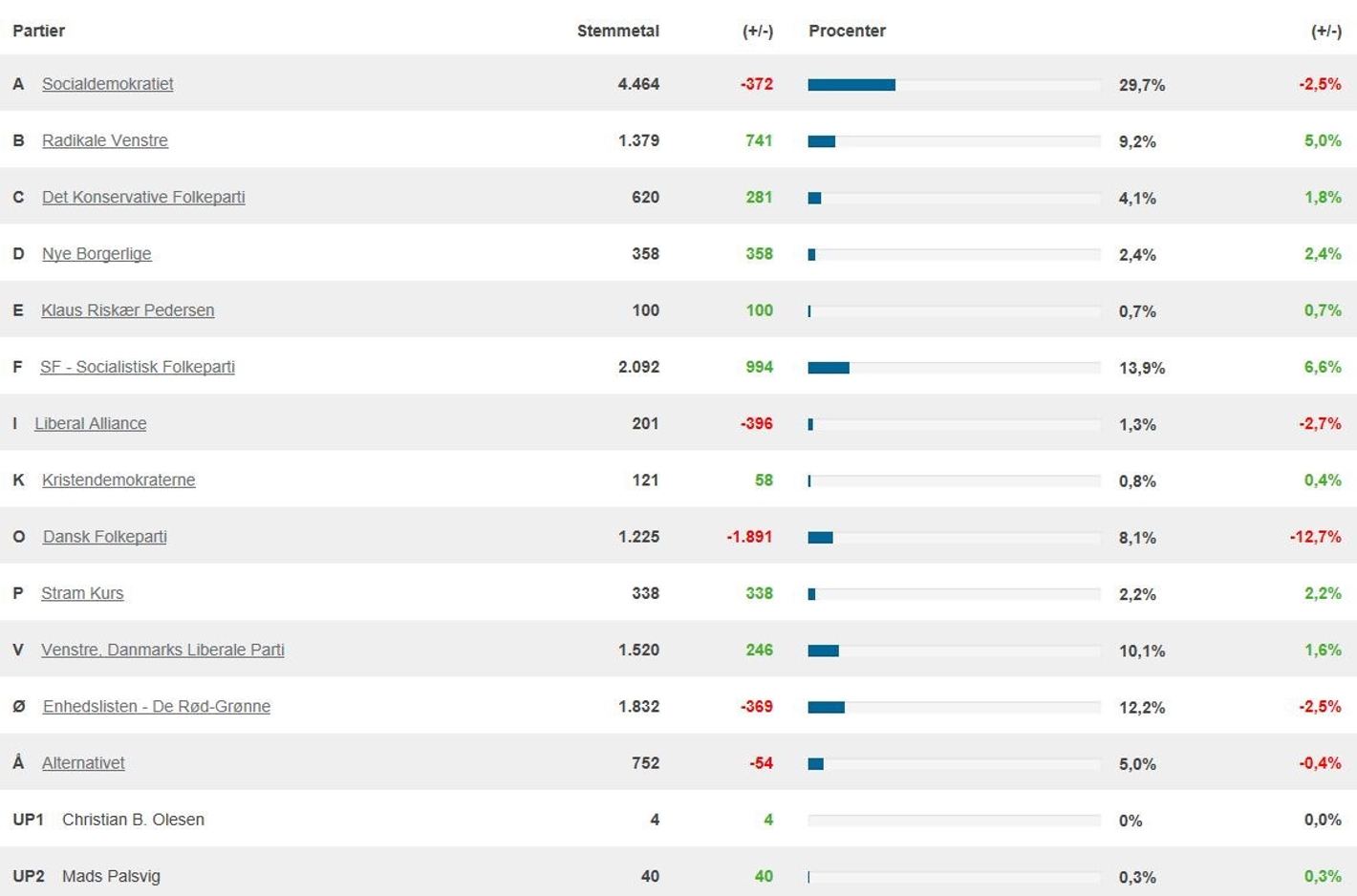Valgresultatet i Albertslund faldt sådan her ud på partierne (kilde; KMD)